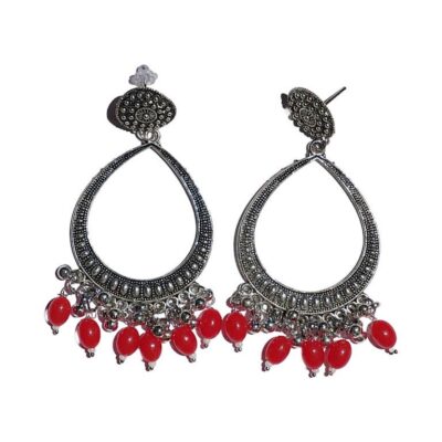Silver Jhumka Drop Shape Red Beads